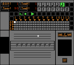 Dezaemon features a full graphics and sound editor, as well as the ability to save via battery back-up. Dezaemon uses a special SXROM mapper for saving, which as of current, has issues on emulators and flash devices (the game will run, but saving via SRAM does not work).