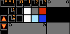 This is where you choose the colors for your designs. There are 2 palettes, each consisting of 4 colors (1 is transparent). The up/down arrows cycle through the palette colors.