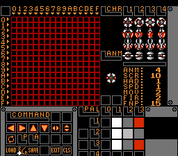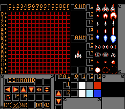 To the far right of the drawing area is the tile selector, this is where the sprites you made are placed. *note - for this menu, the spots are reserved for certain sprites, for example "CHR [1]" is for the ship sprites only, etc..